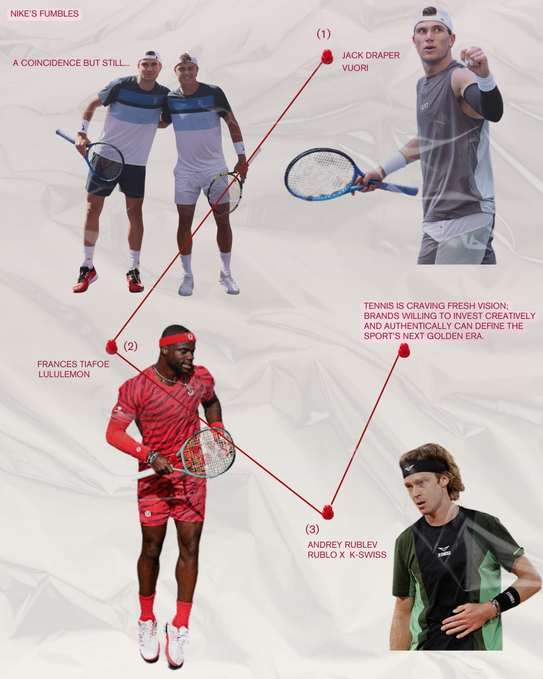 Under their reign, personalised outfits for their champions soared, but now they’ve nosedived from the scene. I’d reckon, now more than ever, they need to up their game because tennis and tennis fashion are having a genuine cultural moment, yet Nike seems on the fence. But their hesitance goes beyond stylistic choices. Retaining players is not a game Nike is interested in playing— they fumbled Roger Federer afterall. Keeping with this trend, they continue to hemorrhage top names faster than you can say “swoosh.”