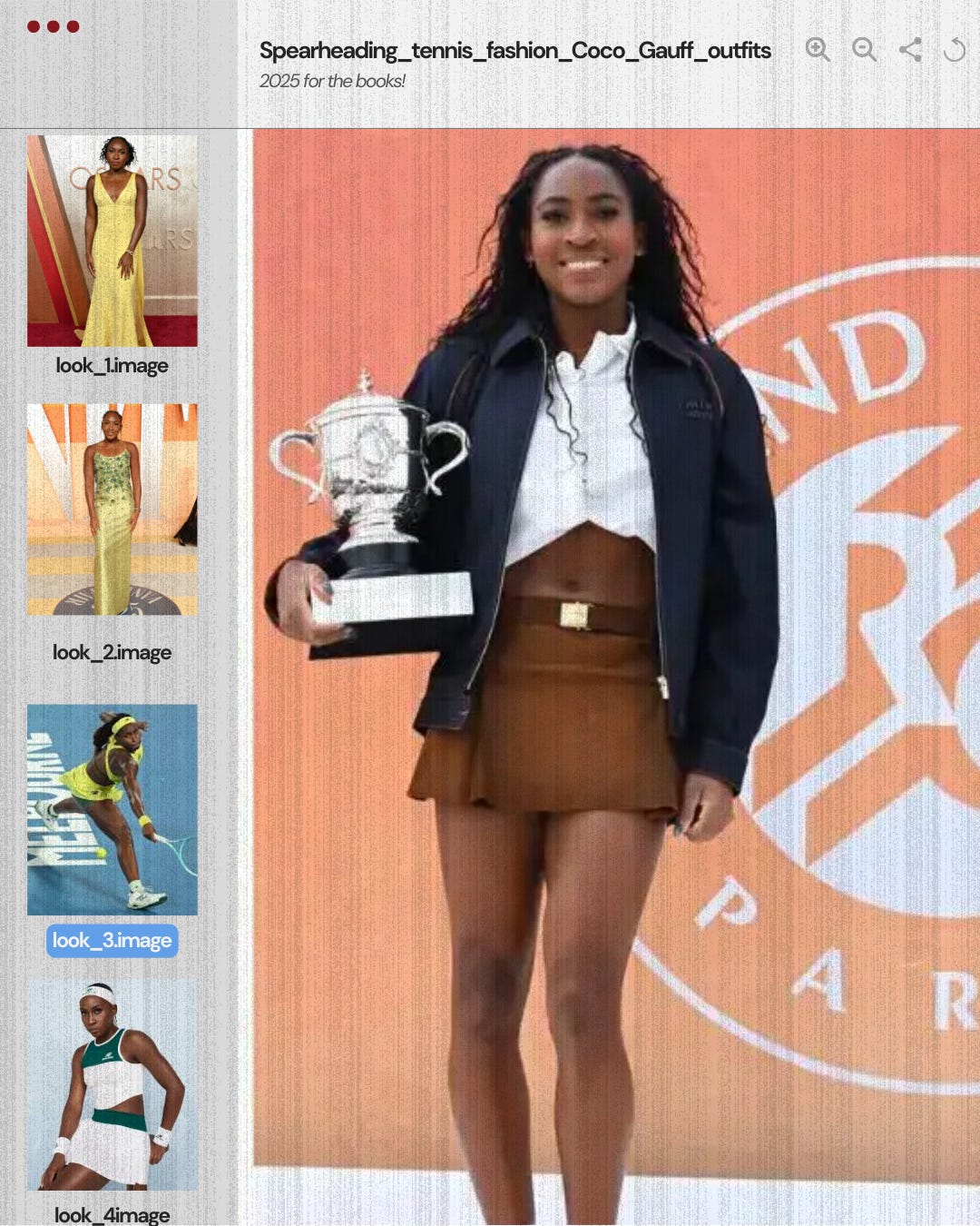 Off the court, she exudes equal glamour. This year, Gauff captivated onlookers at the Academy Awards in a custom Miu Miu soft buttercup yellow gown with a plunging V-neckline, a dramatic draped cowl back, and delicate crystal embellishments. Soon after, she was spotted in a lime-green chartreuse (shartrooz) gown with intricate sequin beadwork for the Vanity Fair after party. When it comes to fashion, Gauff can harness the best of many worlds switching from ultra-glam to preppy styles. For her French Open celebration, she wore a tailored navy canvas blouson jacket, a chocolate brown suede mini skirt and platform loafers merging runway-ready elegance with her signature sporty edge.